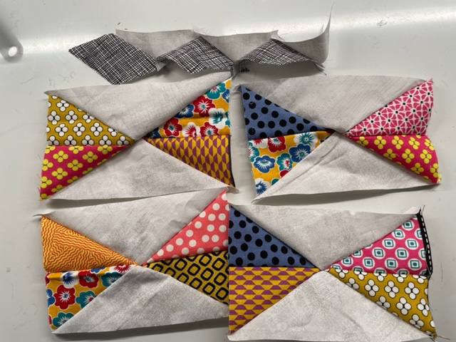 I cut lots of strips from lots of cheddar fabrics. How many strips? A LOT! I will admit that I never measure the quilt circumference OR make 'just enough' binding. I alway cut more than I will think I'll need. Leftover binding gets wound up and put in my drawer for extra bindings. Sometimes I get lucky and find the perfect leftover piece all ready for a quilt.